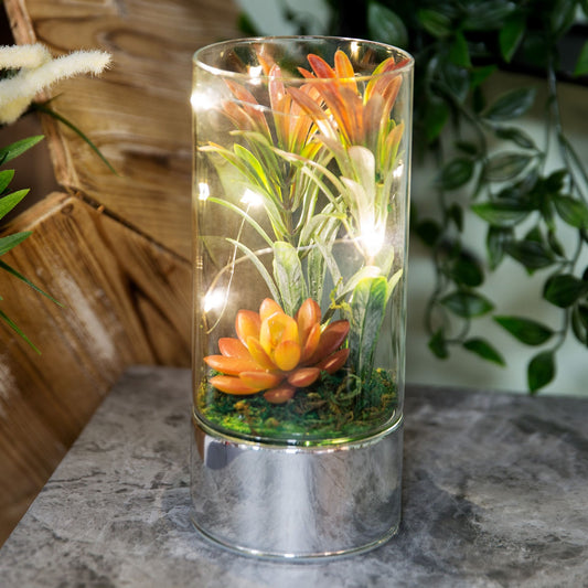 Hestia Glass Terrarium LED Light With Orange Artificial Succulents 20cm