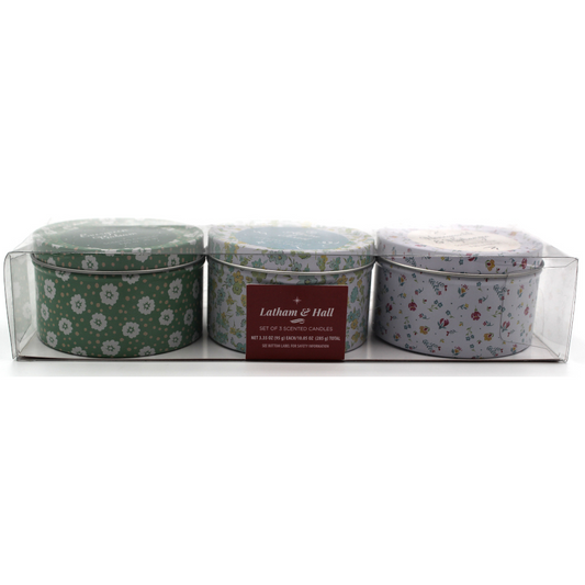 Latham & Hall Set of 3 Scented Tin Candles - Evergreen Balsam, Alpine Forest, Honeysuckle & Hydrangea