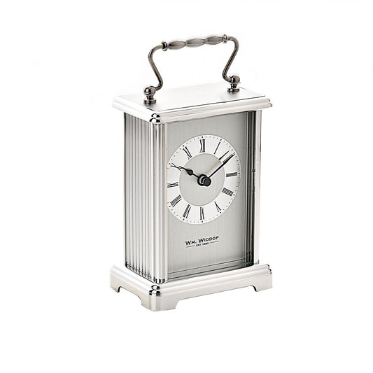 William Widdop Silver Finish White Dial Black Roman Numerals Carriage Clock