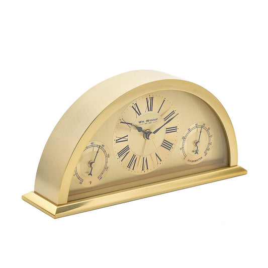 William Widdop Brushed Gold Arched Mantel Clock With Thermometer and Hydrometer
