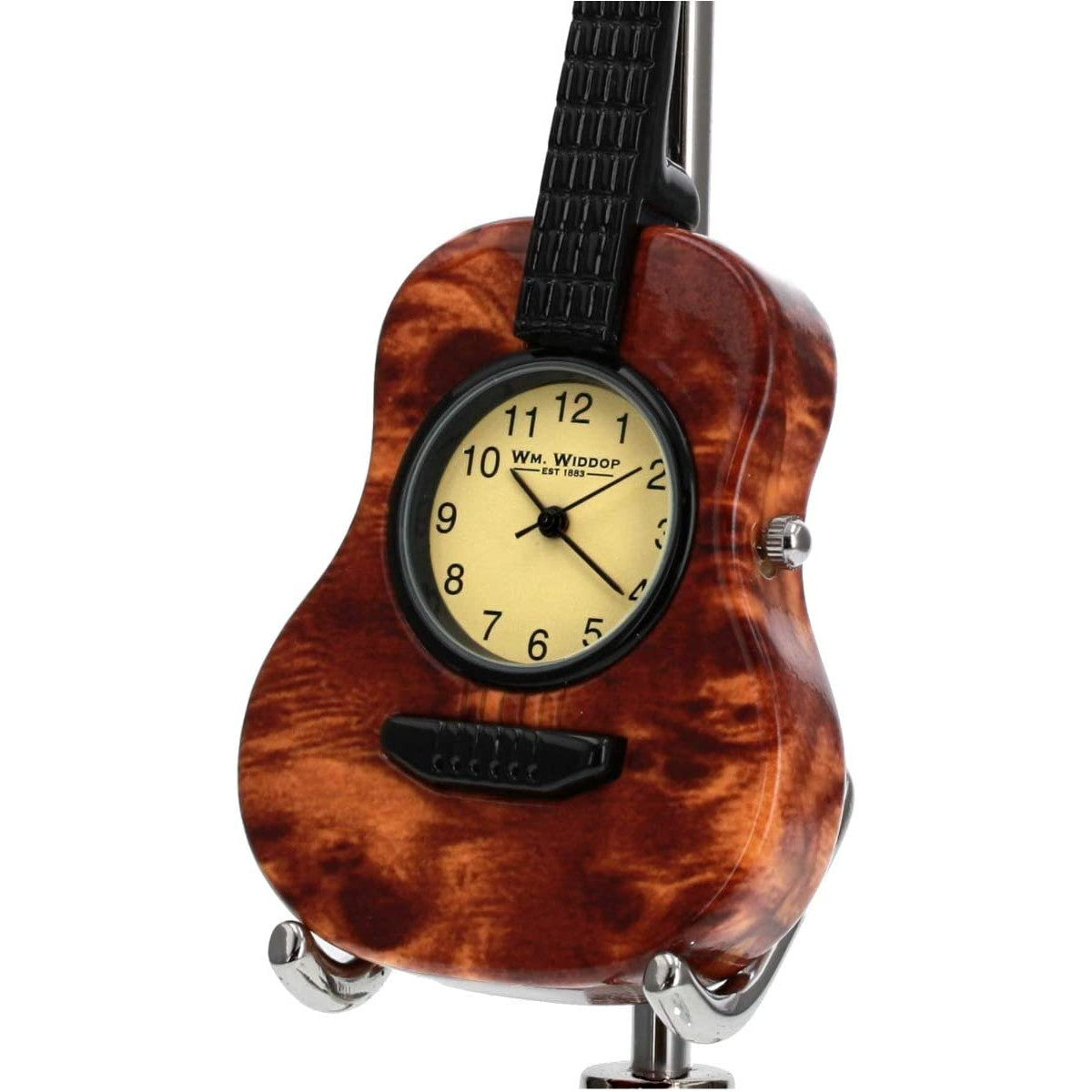 A guitar miniature clock from WILLIAM WIDDOP®. This dazzling guitar clock has a lasting style that would complement any bedside table or living room mantelpiece. The clock design showcases significant attention to detail. The clock face takes the place of the guitar's sound hole with a clear Arabic dial and slimline contemporary clock hands.