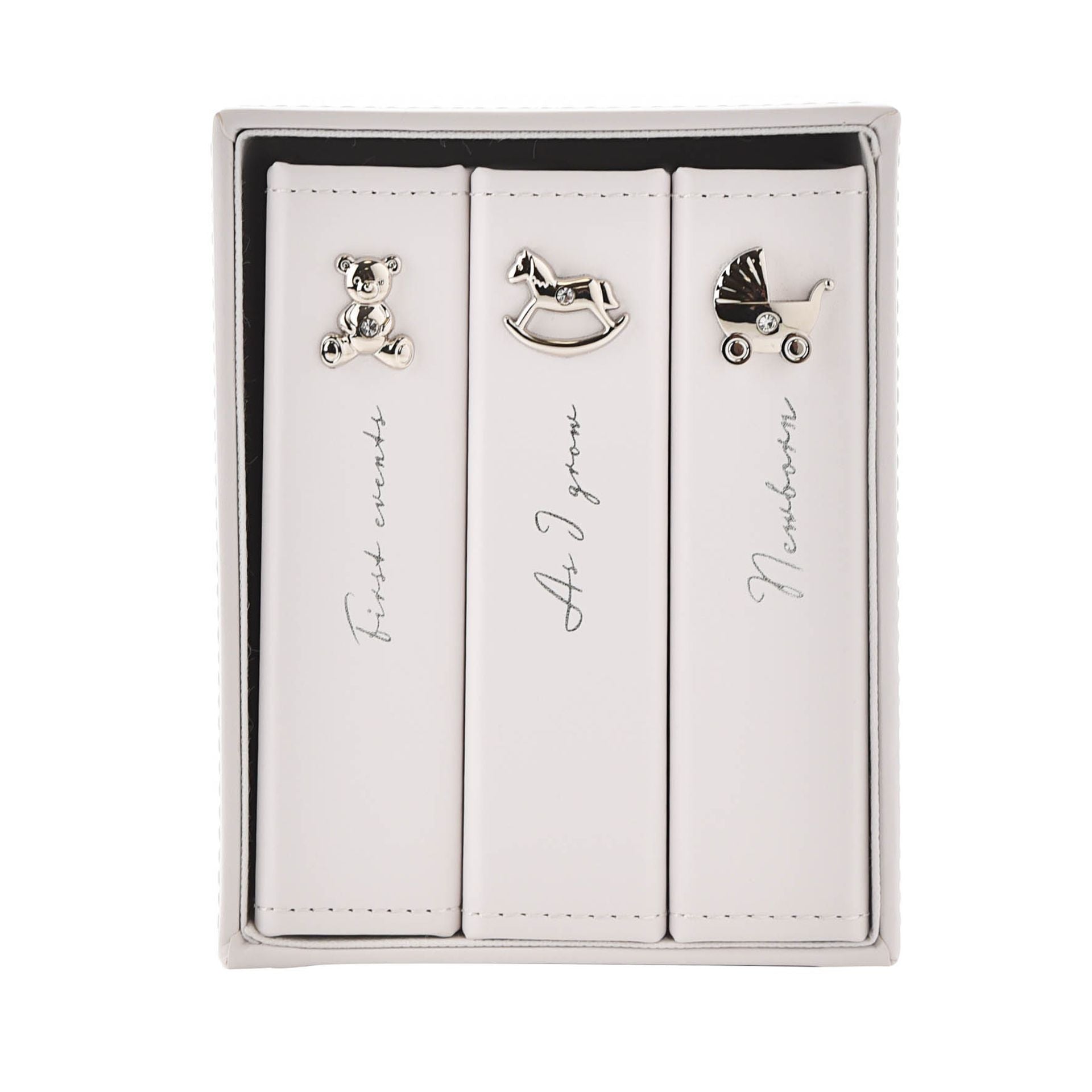 This Bambino Baby Photo Albums set includes three linen-bound albums with a woven finish, each holding 24 photos in 6 x 4" size, and a matching binder. Each album has an embossed silver foil spine with 'Newborn', 'First Events' and 'As I Grow' titles and a crystal encrusted iconic depicting a pram, teddy bear, and rocking horse. Packaged in a branded closed box, this is an ideal way to preserve memories of your newborn.