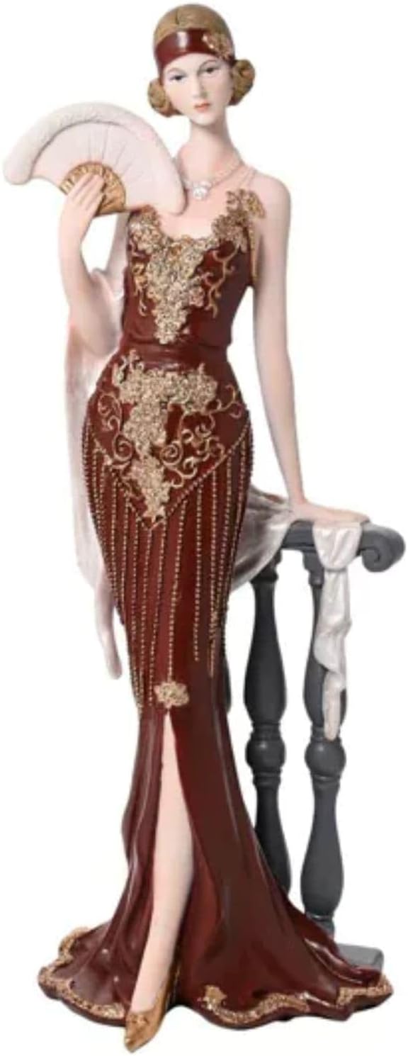This collectible figurine, strikingly posed with a classic hand fan, belongs to the Broadway Belles series and is an ideal decorative gift. Crafted from resin in an attractive dark berry shade, it features a dazzling glitter finish. Perfect for bringing the elegance of the 1920s and 1930s Art Deco era into your home or store.