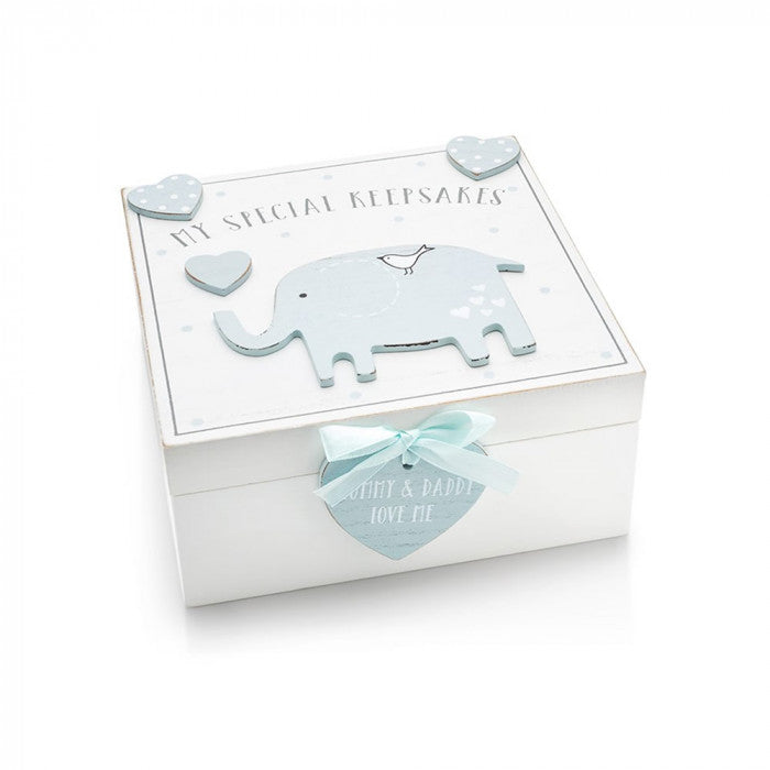 This stylish keepsake box from the Petit Cheri Collection by CELEBRATIONS® allows you to preserve precious memories from your baby's early days. Its distressed whitewashed wooden box, 3D pastel blue elephant character, and heart-shaped clasp storage make it charming, rustic and utterly delightful. Perfect for special mementos, including photos, hospital bracelets, and socks. Dimensions: 7.5cm x 16cm x 16.5cm.