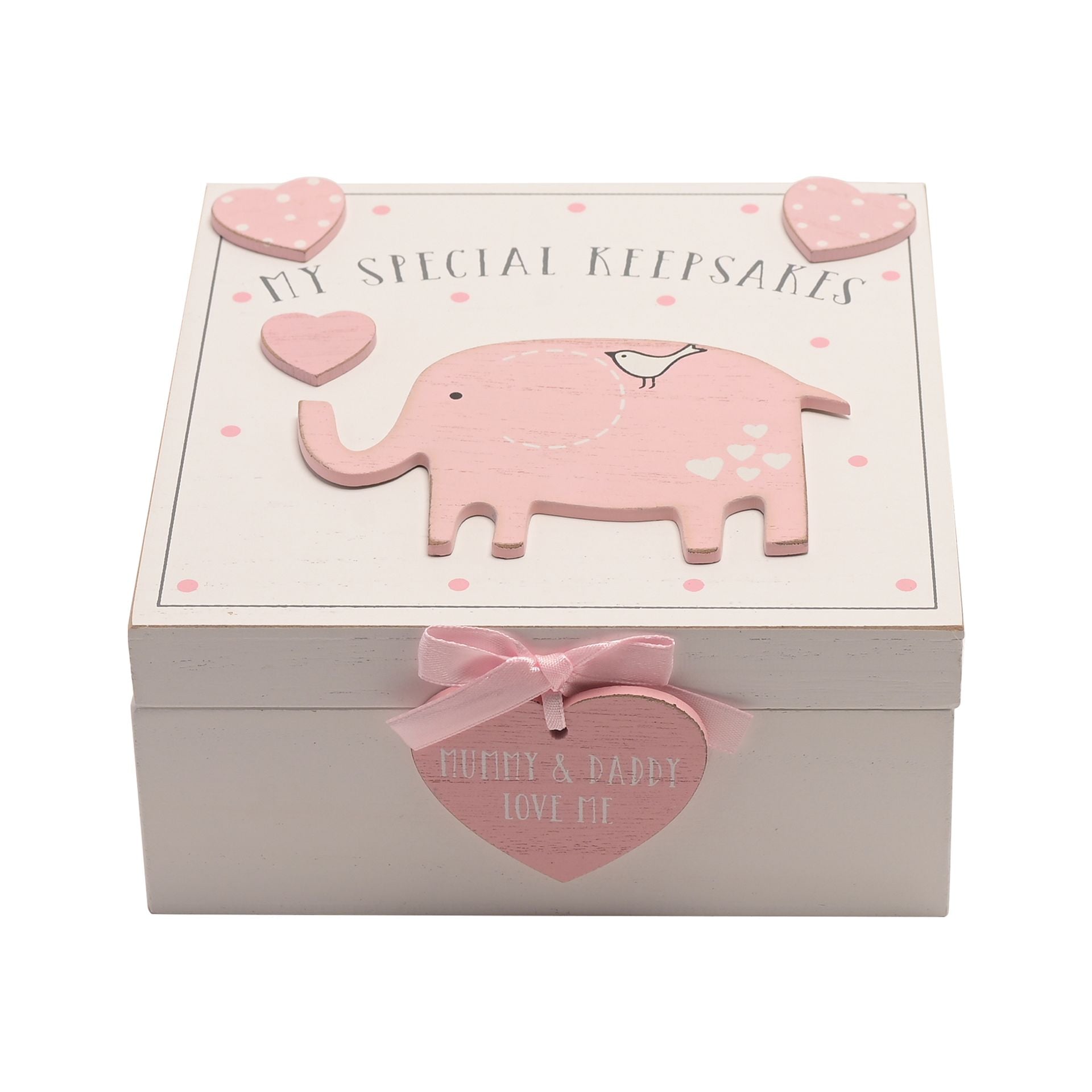 This vintage-style wooden keepsake box is the perfect way to preserve precious memories. Featuring a distressed whitewashed wooden box with pink polka dots, 3D pastel pink elephant character, MY SPECIAL KEEPSAKES title and wooden hearts icon decorations, it's ideal for storing photos, hospital bracelets, socks and other early memories. Measuring 7.5 x 16 x 16.5 cm, this charming piece is from the Petit Cheri Collection by CELEBRATIONS®.