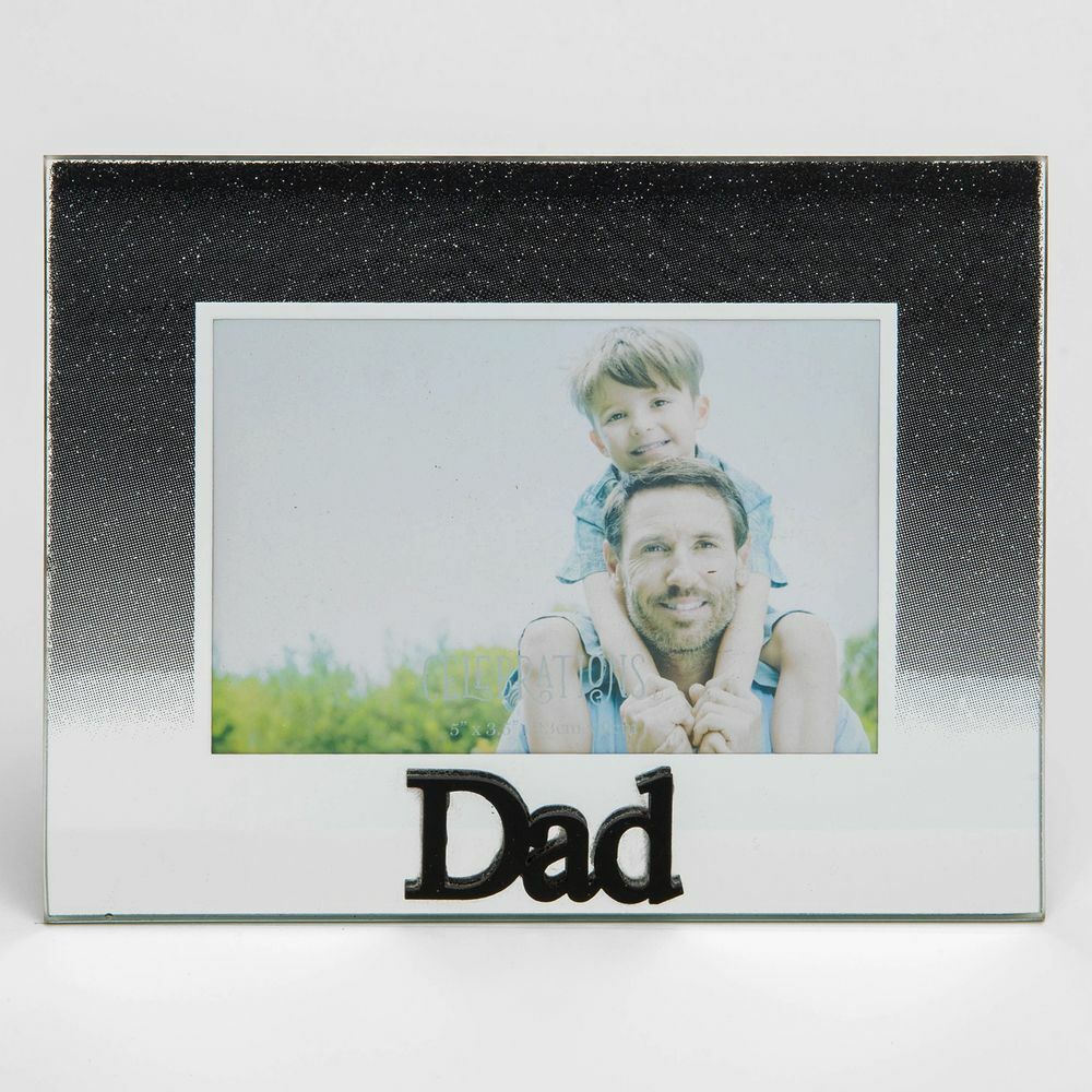 This CELEBRATIONS® black glitter and mirror glass photo frame is perfect for displaying a special photo in your home. Featuring a mirror finish glass frame, a black glitter cascade design, and a black acrylic DAD title, this 5" x 3.5" (13x9cm) landscape aperture frame comes with a standing strut and is supplied in an open gift box.