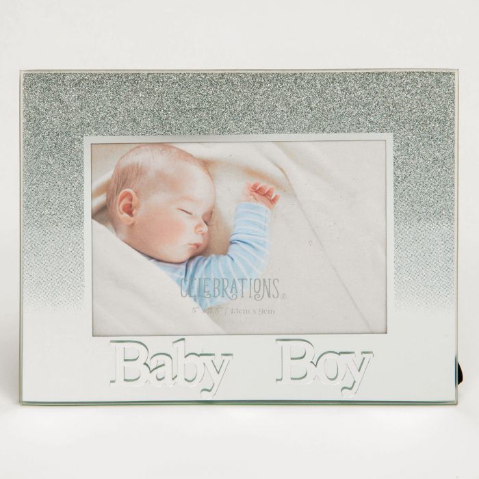 Celebrations Baby Boy Silver Glitter Glass Frames | Standing Strut | Mirror Finish