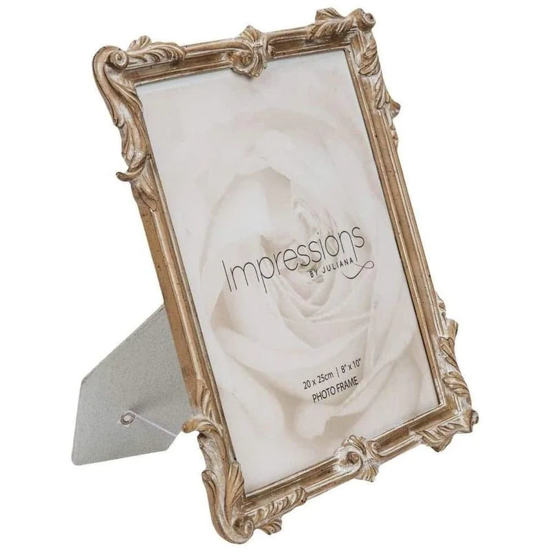 This stunning baroque-style frame from Impressions is crafted with a beautiful resin construction in a distressed bronze wood finish. Its intricate design and 8" x 10" portrait/landscape aperture helps preserve cherished memories. Additionally, the grey velveteen backing, standing strut, and hanging hook provide enhanced display capabilities. Impressions offers a diverse range of frames in traditional sizes and finishes, all encased in elegant gift packaging. Whether silver plated or rustic oak, each frame guarantees years of stylish photo storage and display. As a world-leading photo frame collection, Impressions has modern silver plated and classic resin designs for both wall hanging and free-standing styles.