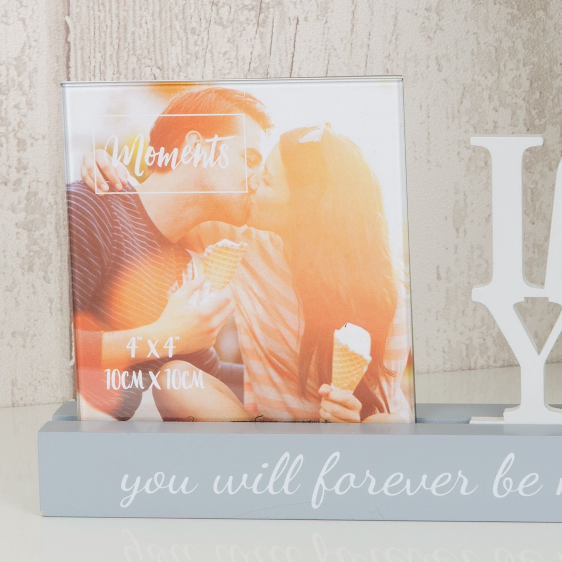 Show your beloved just how special they are with this charming 4x4 inch aperture freestanding mantel frame. It features 'I [heart] you' white cutout lettering on top of a grey baton plinth with the thoughtful cursive 'you will forever be my always' motif. An ideal gift to express your deepest love and affection.