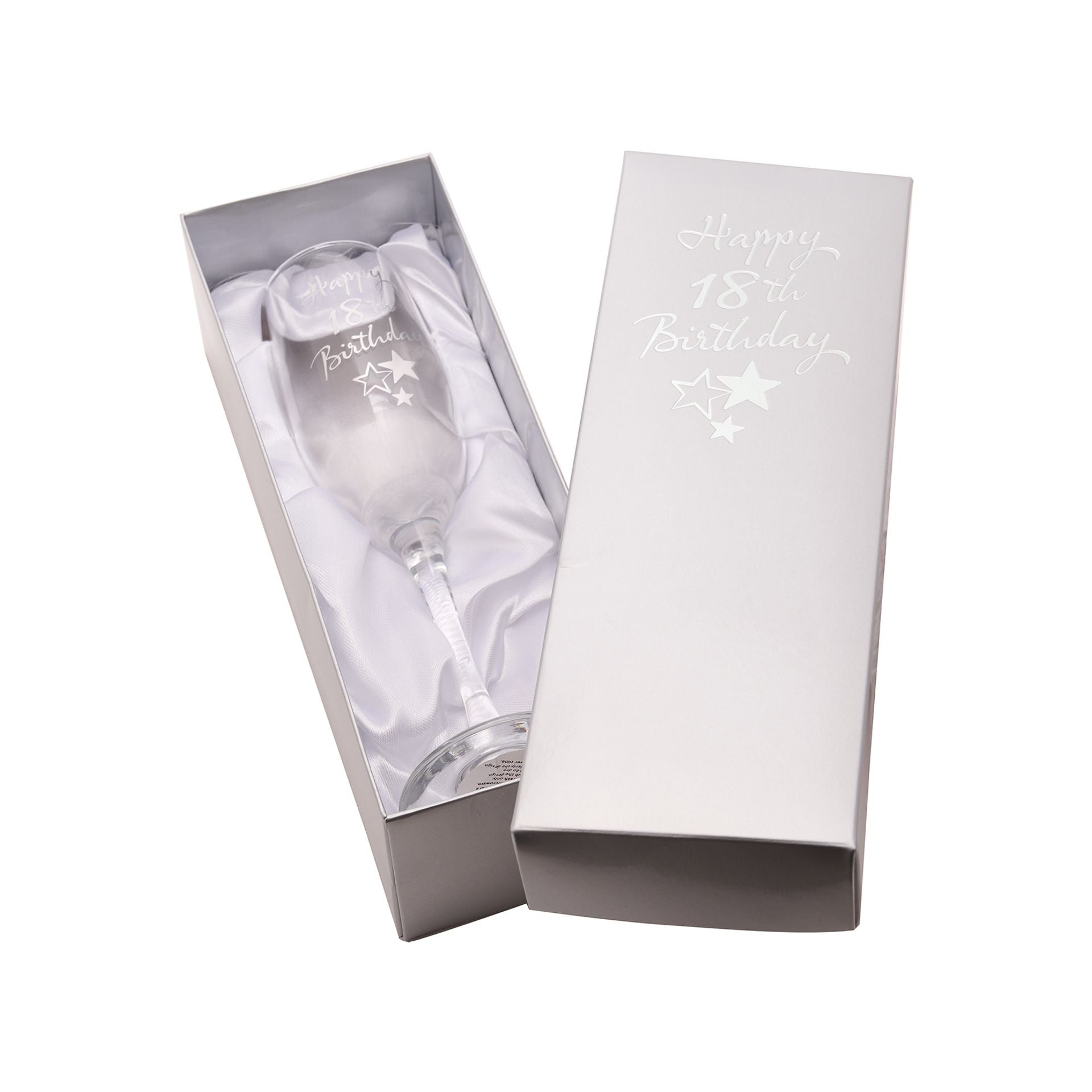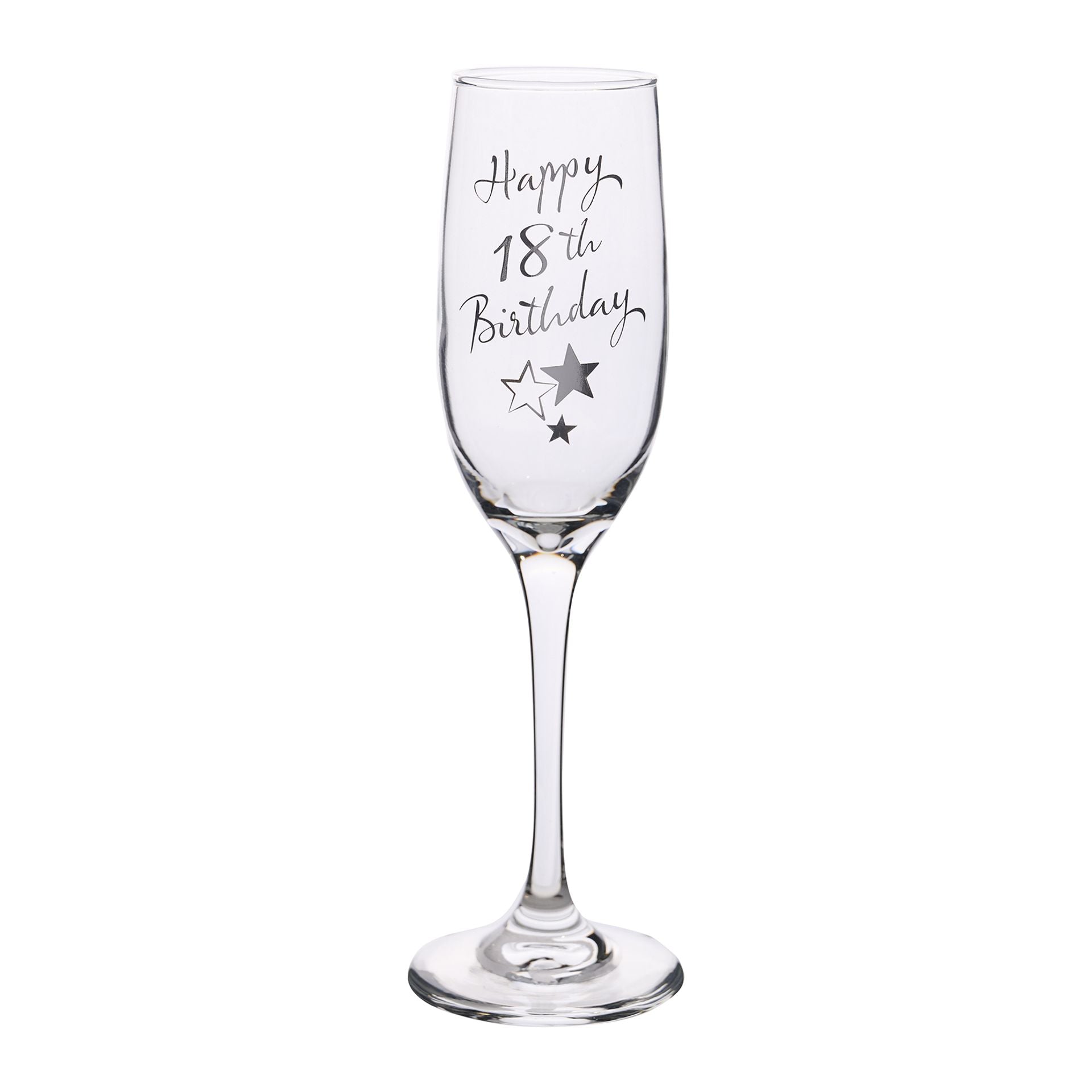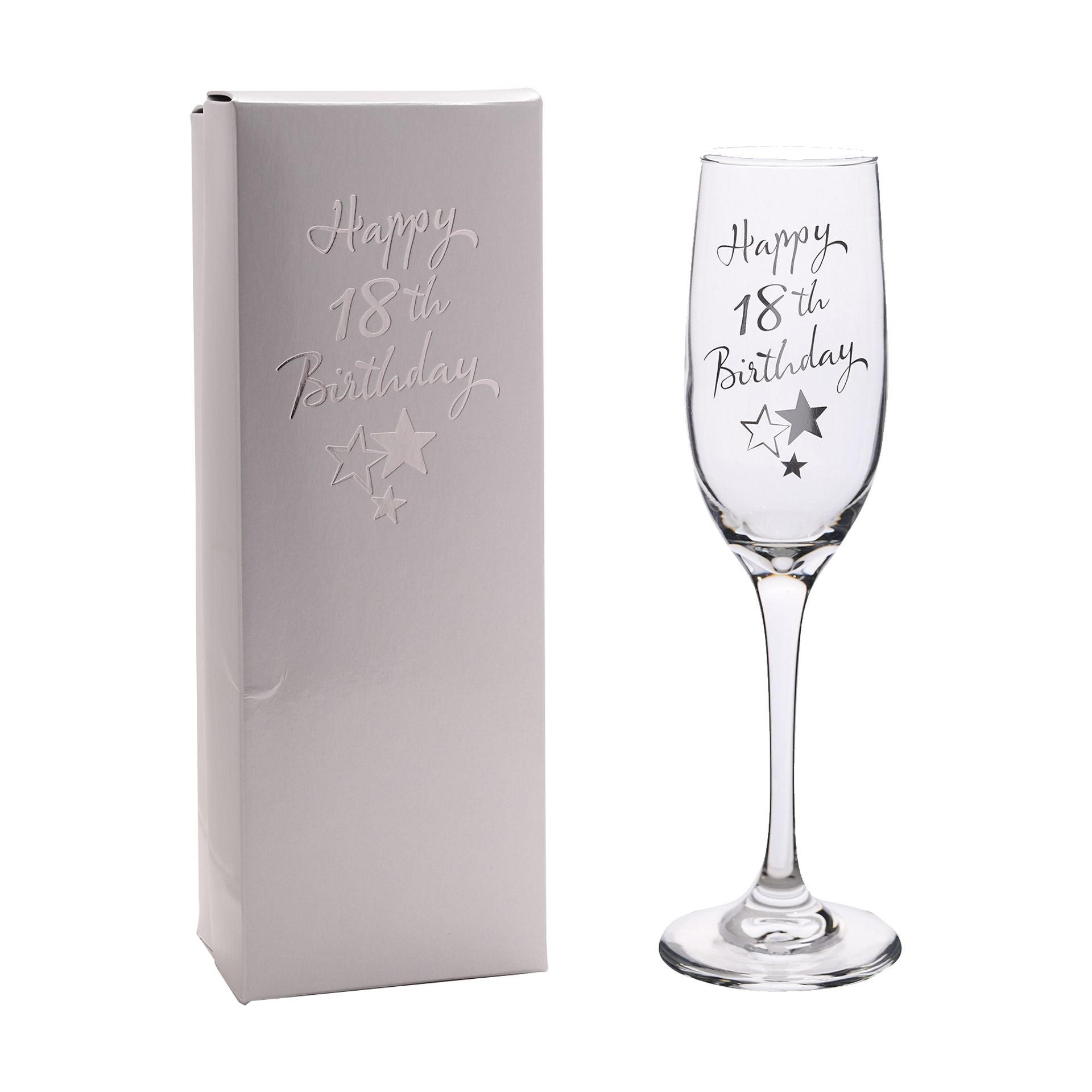 This celebratory Juliana 18th Birthday Champagne Flute is adorned with a 'Happy 18th Birthday' message, surrounded by silver stars for a special touch. Both elegant and thoughtful, this gift is perfect for someone turning 18 and comes complete in a high quality, satin-lined display box.