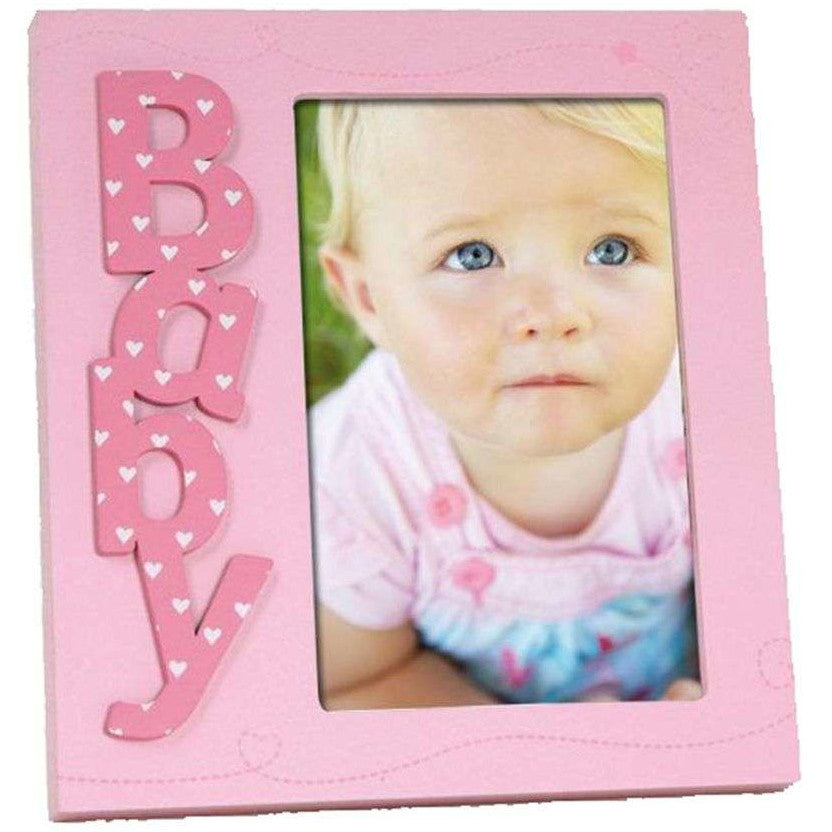 Little hearts and stars adorn the beautiful Marzia Baby Pink 6x4 Photo Frame, a perfect addition to any child's nursery or bedroom. The soft pink hue offsets the deeper pink of the word Baby, with delightful white hearts. Protected under a glass front, the 6x4 aperture is slightly offset to the right. The frame is 7x6.5 inches and can easily be hung or propped up by the strong strut on the back.