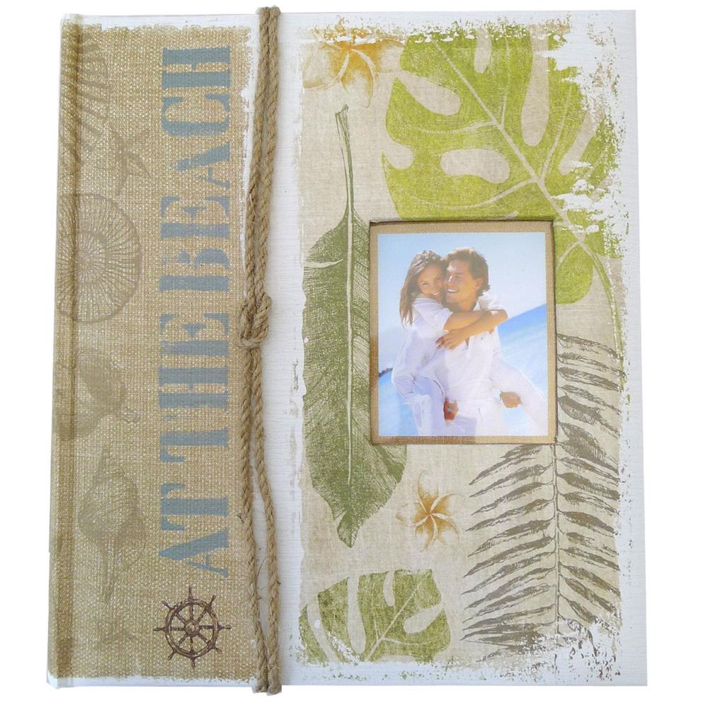 The Maui Green Photo Album accommodates 200 landscape-format 7.5x5 inch photographs in protective clear plastic sleeves with adjacent memo spaces. Its cover features an evocative "At the beach" design with decorative leaf motifs, while a customisable photo slot allows for personalisation. Interior pages complement the cover aesthetic with premium plastic pockets that shield photographs from fingerprints, dust, and environmental contaminants. This substantial album measures approximately 11x9.75 inches (HxW), providing an elegant storage solution for preserving holiday memories.