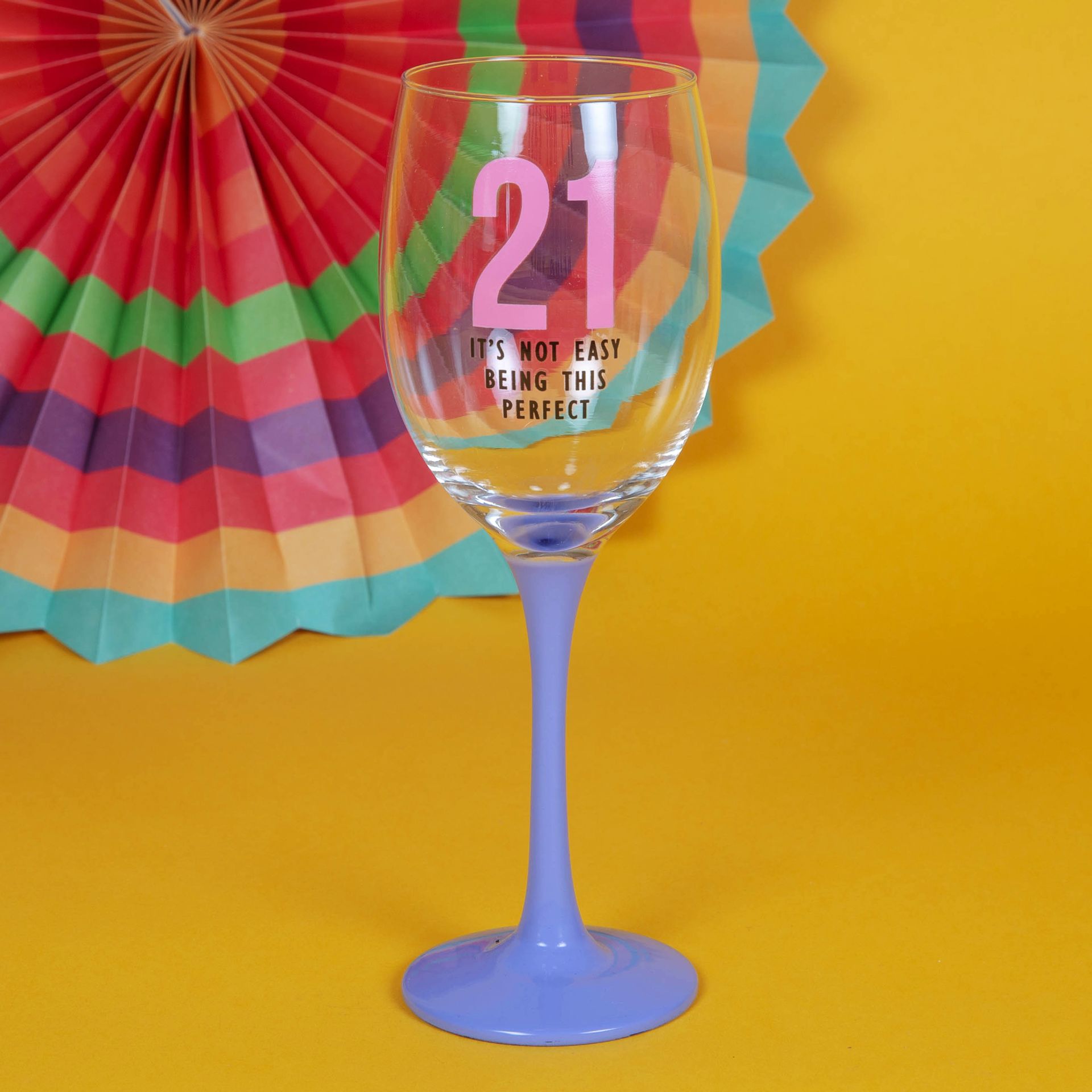 Raise a glass to a special 21st birthday with the Oh Happy Day! Birthday Wine Glasses 21. This 250ml wine glass features a purple stem and base, plus a special IT'S NOT EASY BEING THIS PERFECT sentiment. Comes in a branded gift box so you can gift it straight away! Celebrate the big birthdays with Oh Happy Day! by CELEBRATIONS® - the ultimate one stop shop for gifts.