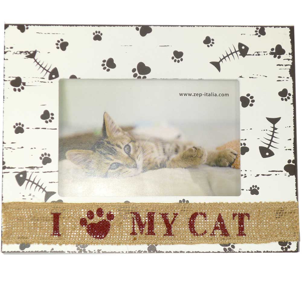 This charming frame is the ultimate gift for cat owners! With a 6x4" photo window and a sturdy strut, it's ideal for busy cat lovers. The warm off-white background, brown paw prints, and fish bones look delightful, while the distressed edge adds a stylish finish. The glass-protected aperture reads, "I love my cat" (with the love being a kitty paw print) for an extra-sweet touch. Insert your pic from the back and secure it in place with the easy-to-use rotating plastic catches.