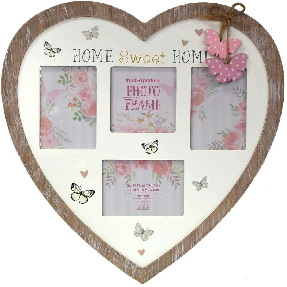 Enliven your home with this beautiful frame, featuring a beech surround with a cream inner and four artfully curved apertures. The two 5x3.5" openings are portrait-oriented, while the 4x4" slot fits Instagram-ready pics - creating a perfect balance. Plus, the "Home Sweet Home" inscription, two wooden butterflies, and tiny hearts make any photo extra special. Easily hang this 16x15.5" piece; the back has serrated bars to keep it flat against the wall. If you want to change pics, just remove the aperture backboards and slip in new ones, and secure them using the included plastic retainers. With this Heart Frame, you can always have your favourite memories in view!