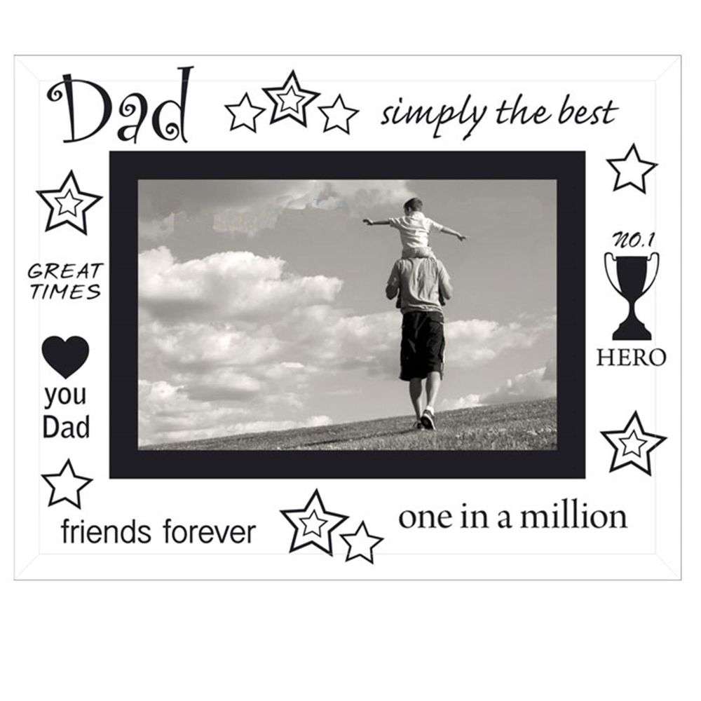 The Sixtrees Dad Photo Frame 6x4 is a glass photo frame decorated in a 'Dad' decal and thoughtful phrases that will bring a smile to his face. Big enough to accommodate a 6x4 inch photograph, so you can display your favourite moment together.
