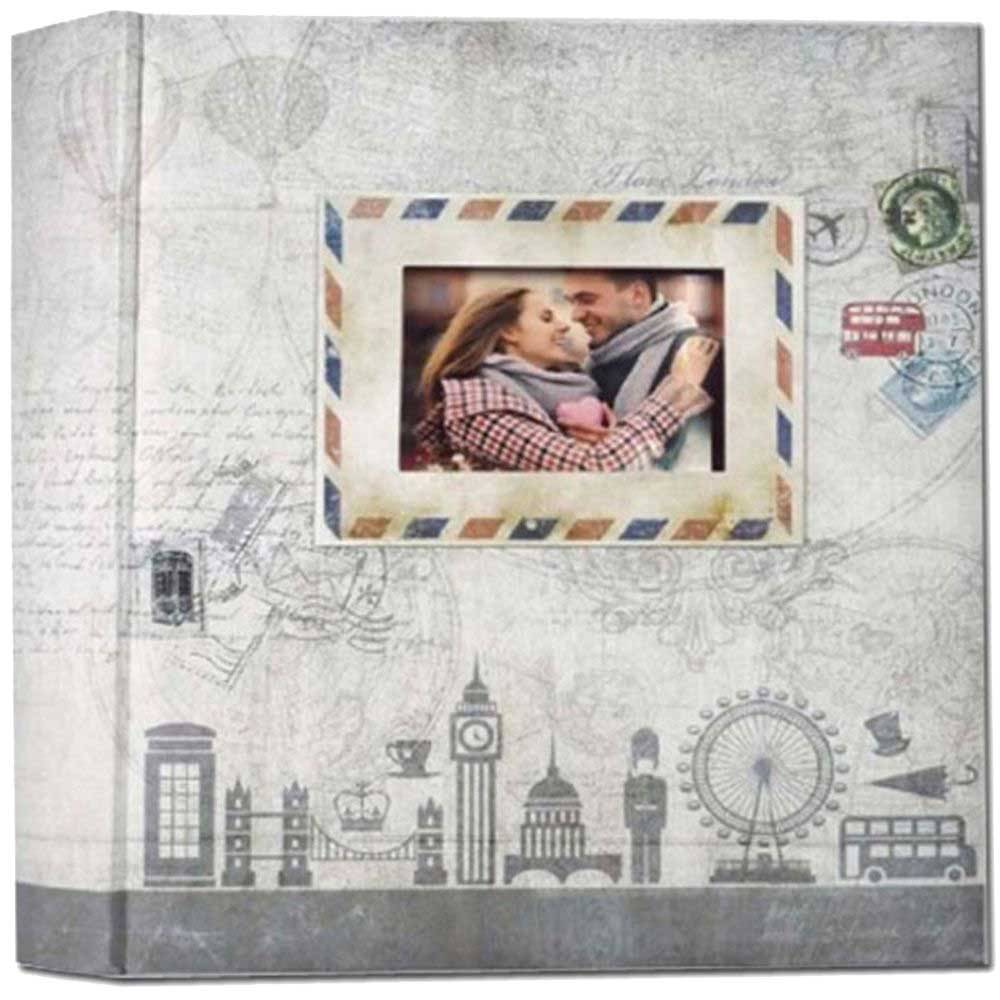 The Ulisse Photo Album can store up to 200 7.5x5 inch photos, making it the perfect choice for holiday memories. It features a 3.5 x 2.5 inch aperture on the front cover framed with a cardboard airmail letter design for a 3D effect. A subtle design of postage stamps and old-style writing gives the album an antique vibe, complemented by silhouetted buildings along the bottom. The back of the album is designed to tie in with the front cover, including a bold bottom border colour. Inside, the bookbound pages are a crisp white and contain an area for written notes, with each clear plastic pocket shaped for landscape-style photos. Overall size is 11.25x9 inches (HxW).