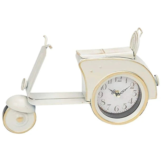 A stylish, retro scooter shaped mantel clock. From HOMETIME - unbeatable style and astonishing affordability in contemporary timekeeping. Details: - Cream metal case - Gold trim details - Retro moped scooter design - White clock face with Arabic numeral dial - Black serpentine hands - Ultra-precise quartz movement - 1 x AA battery required (not incl.) The perfect gift for a motoring enthusiast. In a world where standalone time pieces are no longer a necessity, HOMETIME was launched in 2010 as a fresh new take on clocks that bring trend led but practical style, alongside the quality of a long-lasting keepsake.