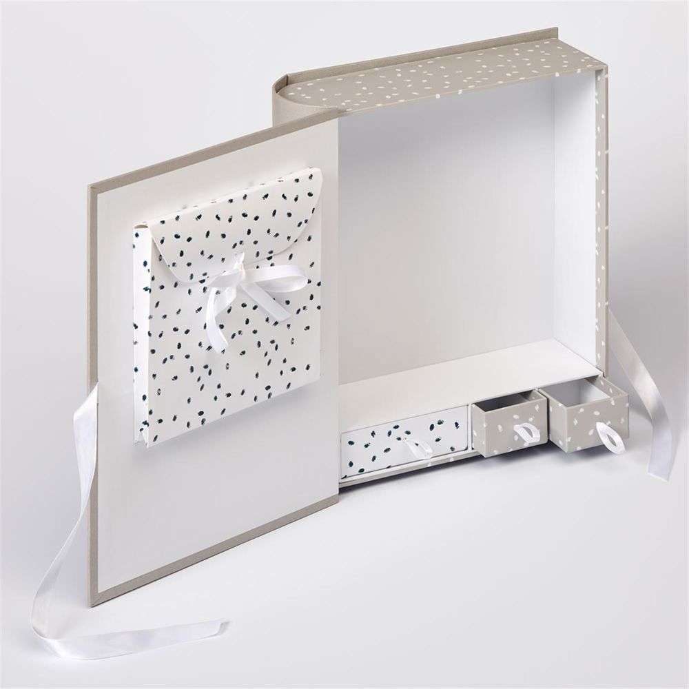Introducing the extraordinary Walther Madu Baby Keepsake Box, measuring 13x11x3.5". Made with superior quality and attention to detail, it is perfect for storing all of your baby's precious first items - from locks of hair to tiny shoes. The inside of the box has been meticulously designed with two small drawers for smaller items and a larger drawer for separating important keepsakes. The inside measures 9.5 inches wide, 10.5 inches tall, and 3 inches deep, and is elegantly lined with bright white, high-quality paper. The three drawers feature alternating grey and white spots, which are also replicated on the inside of the front cover. This is ideal for holding small documents or cards sent after your baby's birth, and the beautiful white ribbon serves as a charming closure. The drawer tabs are also made of the same ribbon material, making them easy to open. The sweet grey and white hippopotamus and snail design on the cover is so cute, what a perfect way to store your babies items.