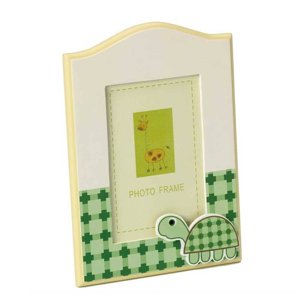 Bring life to any bedroom with the Wild Animal Tortoise frame! The perfect piece for a kid's room, its unique Tortoise design stands out against three contrasting colours of green at the bottom right. A beautiful, sinuous pattern winds its way up halfway up the frame for a touch of vibrant colour, while creamy tones form the top half and complete the arched edge. The deep cream frame and curved aperture edges round out the look, while a strong strut on the back secures your cherished photo. Measuring 8.75 x 6.25 inches, the Wild Animal Tortoise frame is a delightful way to display your photos!