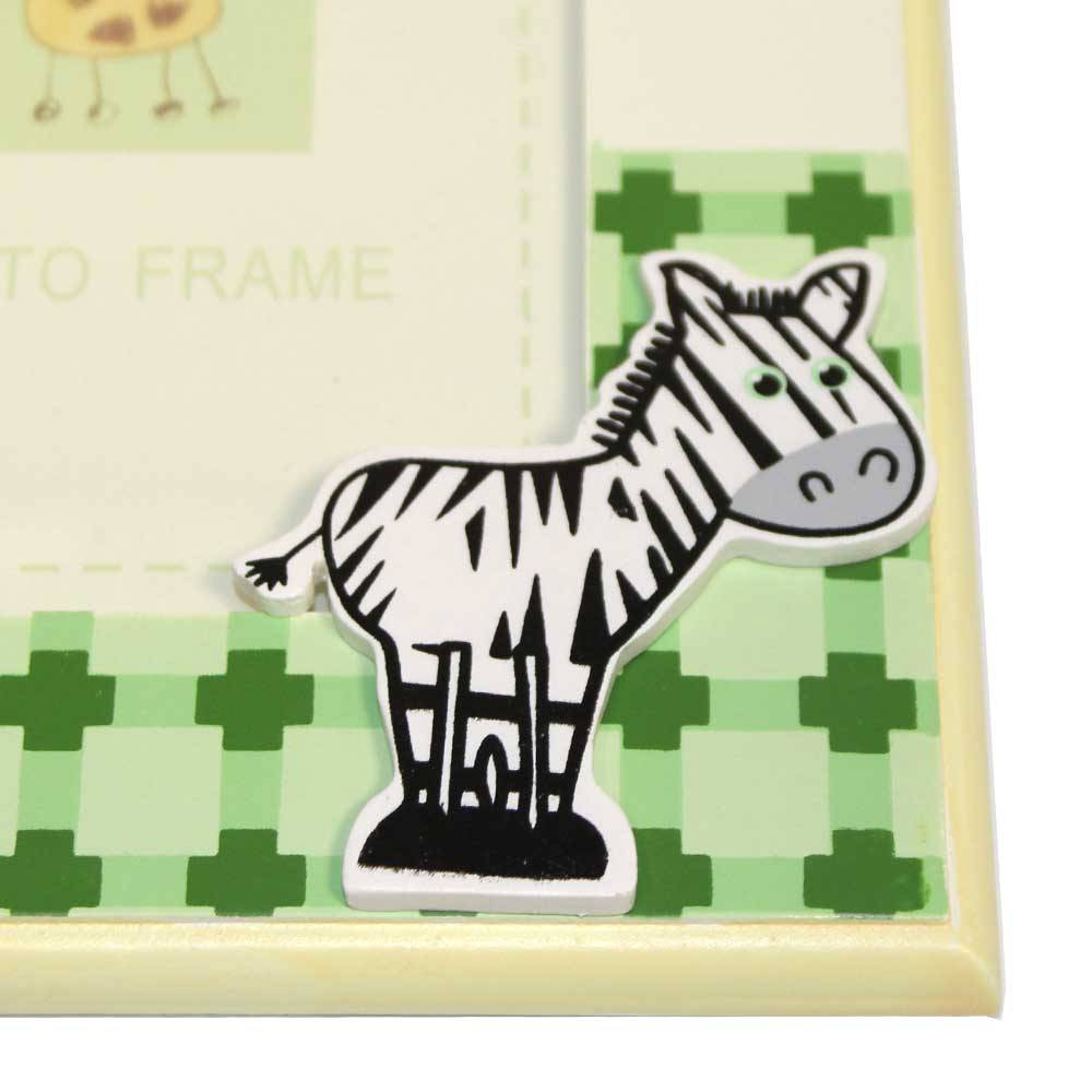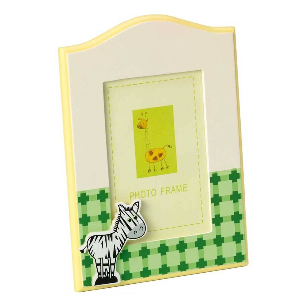 Wild Animal frame is a perfect choice for a little one's nursery! Featuring a cute Zebra on the bottom right and three green crosses to contrast against the Zebra's black and white stripes, this frame will bring some excitement and life to any room. Above the pattern, the frame is a creamy colour all the way up to the arch-shaped top. The outer rim is finished in a deep cream shade and the aperture's edges are gently curved for a softer look. When you're ready to hang your photo, simply remove the backplate and pop it in. With overall measurements of 8.75" x 6.25", this frame will be a beautiful addition to any home!