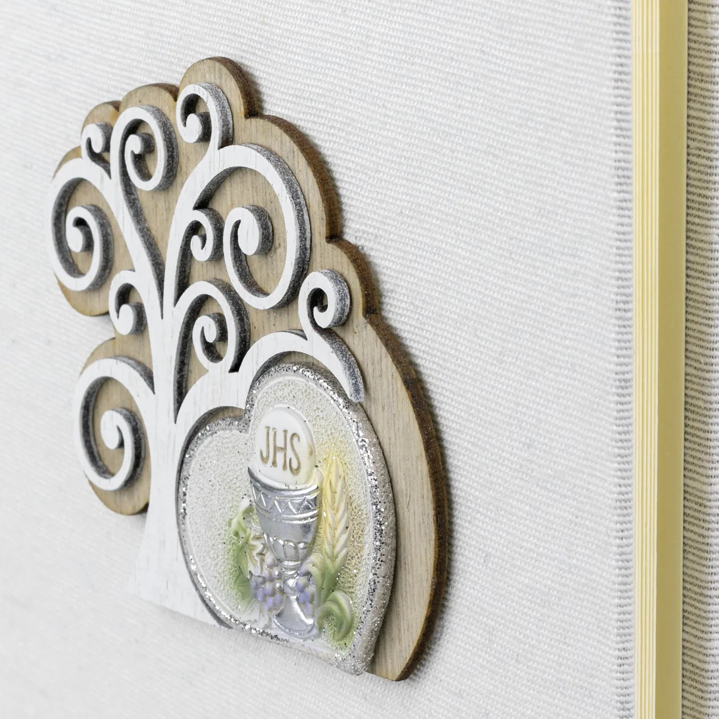 Wrapped in an off-white fabric cover, the album showcases a timeless Tree of Life motif alongside a symbolic Holy Communion emblem, creating a meaningful and elegant design. Its traditional bookbound format offers a sense of permanence, making it not just an album but a true family keepsake.