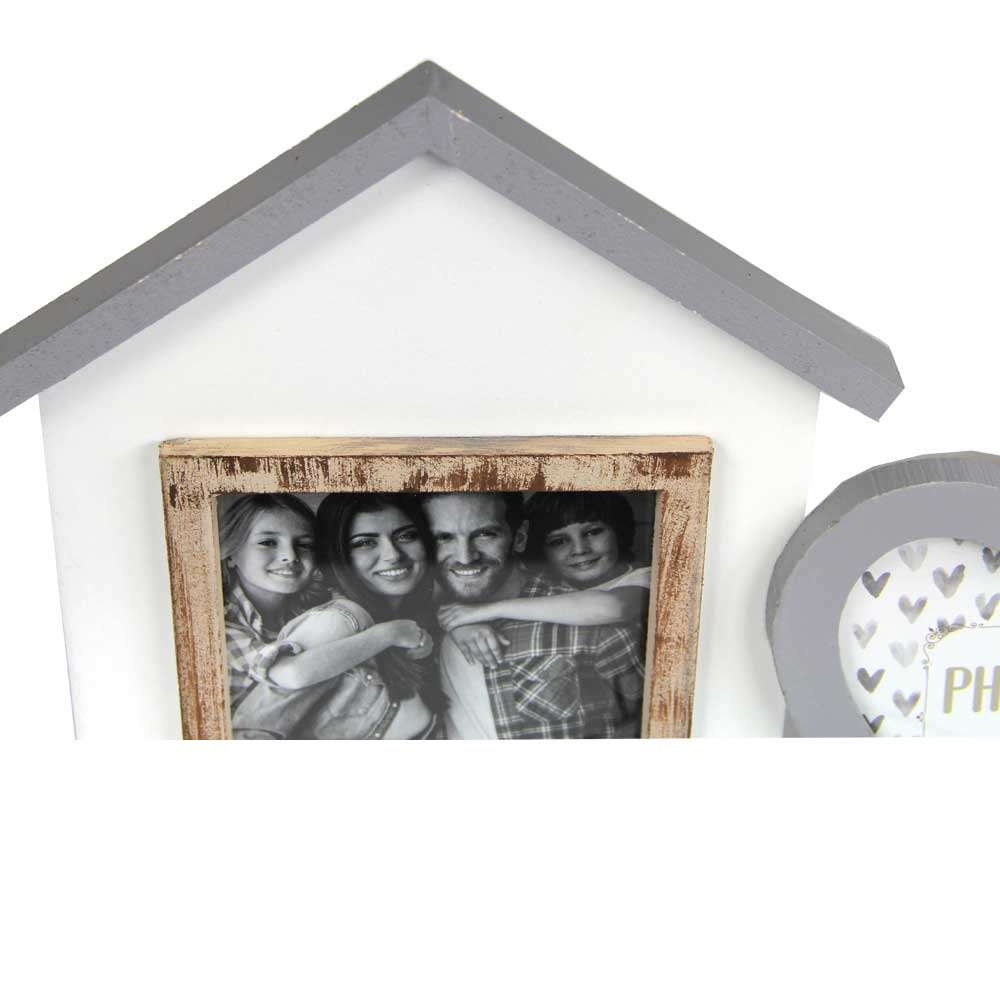 This wood frame with a natural finish on the base board and one of the apertures, combined with the white part featuring a secondary surround, grey-roofed house and silver watering can, creates a unique, homely feel. The painted grey heart-shaped middle aperture can accommodate a 4x4.5 inch photograph, while the other two apertures take a 6x4 inch photograph. Plastic swivel tabs secure the backboards to hold the photos in place. The base is solid and wide, allowing the frame to stand securely – a perfect gift for a loved one.