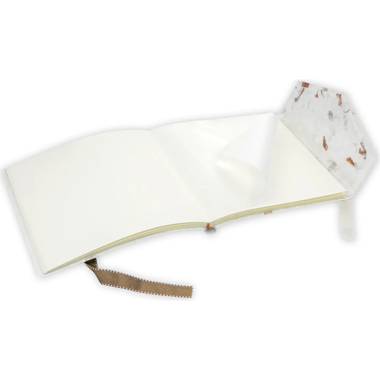 The ZEP Letizia 6 Brown Textured Traditional 23x23 Photo Album - 14 Pages is a beautifully handmade photo album from Italy, designed for storing your most treasured memories. Featuring a traditional bookbound style, it holds 14 cream-coloured sheets with pergamin interleaves to protect your photos. The album is ideal for photos to be sticked in, with each page accommodating images up to 20 x 15cm. It has a charming cream rice paper cover with an abstract brown pattern and decorative fabric bow, adding a touch of elegance. A lovely choice for preserving your favourite moments in a timeless way.