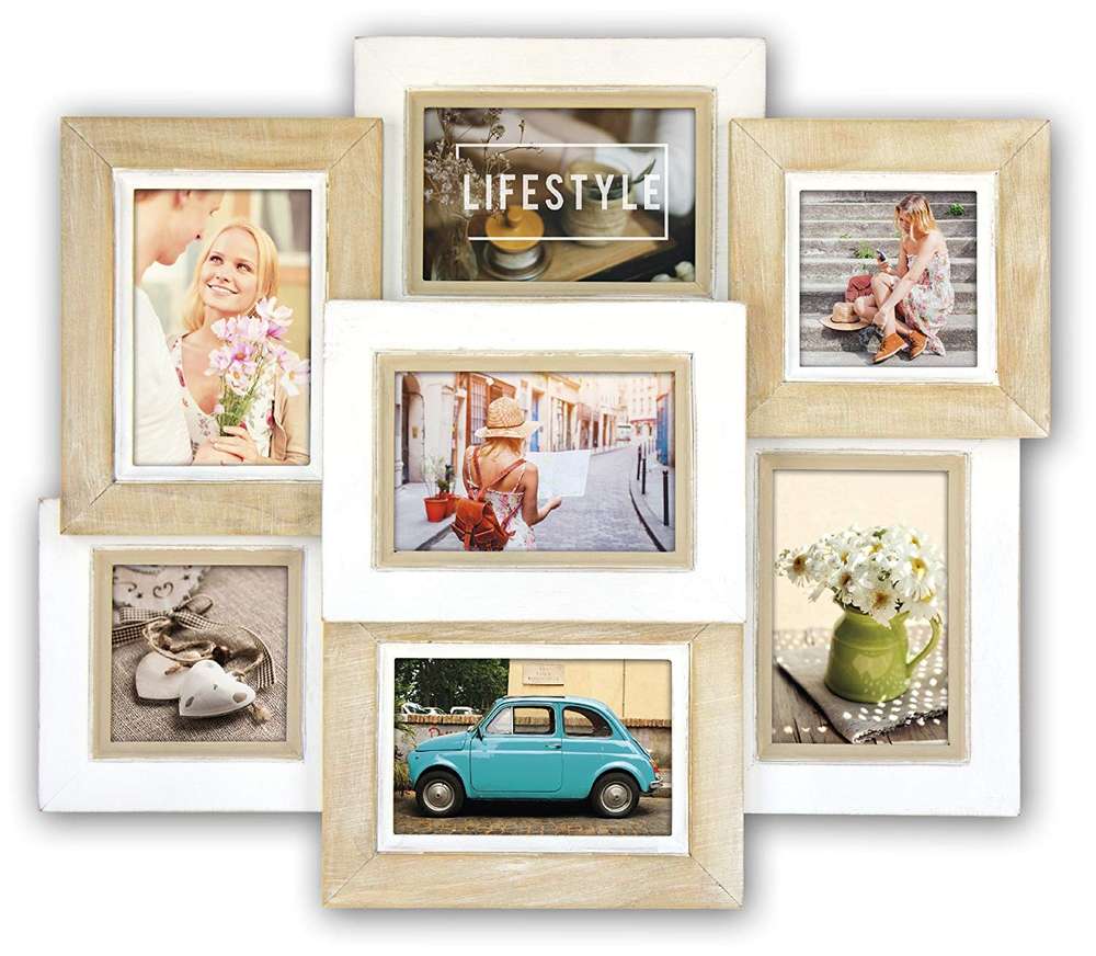 This sophisticated frame features a rustic design, with each aperture displaying a rough, half-finished edge and a bevelled inner rim. The matt finish of each aperture has brush stroke effects, while a contrasting matt paint adorns the inside edge. Glass also serves to protect each photo, and images can be inserted and removed from the back with metal tags. The seven apertures accommodate 6x4 inch photos, with two apertures roughly four inches square. The overall size of the frame is 51.5 x 38.5 x 4 cm, with a serrated bar at the back for easy hanging. Complementing shades of brown and white give this frame a soft feel.